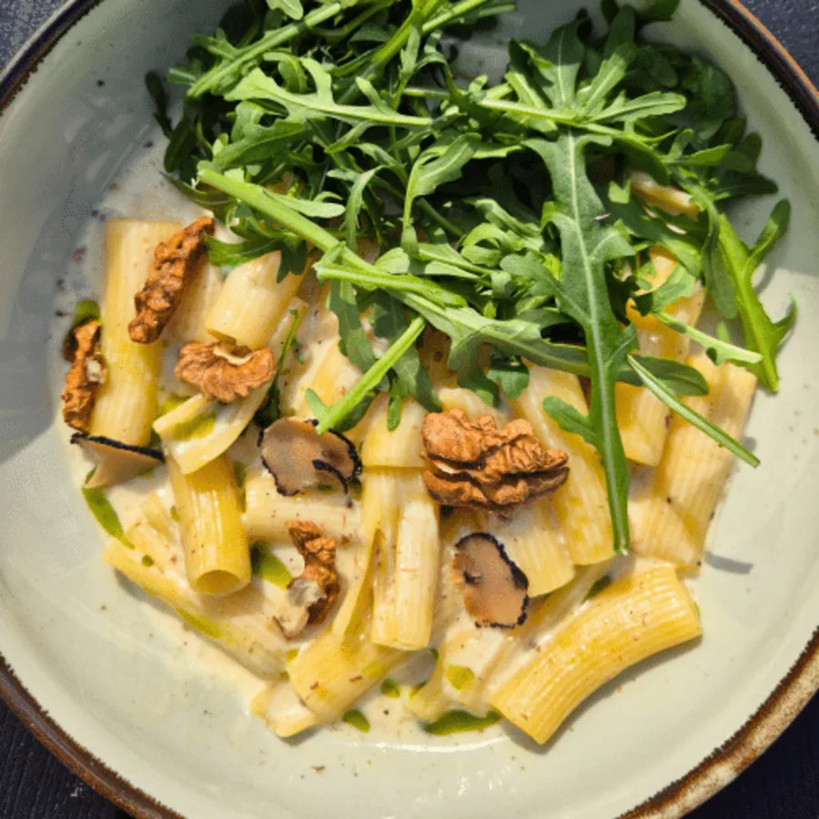 hovädzí flank steak, hľuzovková omáčka, pečené cherry paradajky, ricotta, rukola